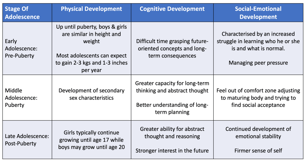 Girls generally hit puberty 12 months before boys but there will be quite a bit of individual variance. Both males and females will experience major growth spurts, increased perspiration and an increased production of oil in the hair and on the skin. Adolescents will develop a greater capacity for future-oriented and abstract thinking and so develop a greater awareness of long term consequences. This can help with their understanding of how the food they eat now impacts them at a later stage.